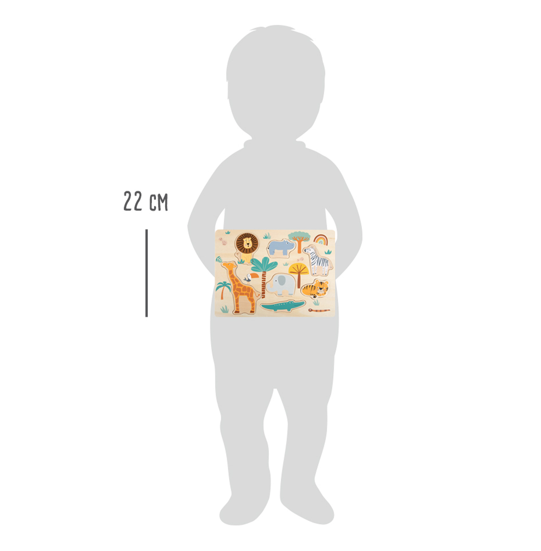Willkommen auf Safari! Bei diesem Setzpuzzle aus Holz gilt es, die sieben Savannentiere in ihre passenden Formen zu setzen. Dabei trainieren Kinder nicht nur motorische Fähigkeiten und Formerkennung, es wird ihnen auch Konzentration und Geduld abverlangt. Durch die fröhlichen Safari-Motive in Trendfarben sowie viele liebevolle Details überzeugt das Puzzle Eltern und Kinder gleichermaßen. Mit diesem besonderen Puzzle macht ein Ausflug in den Lebensraum von Giraffe, Zebra, Elefant und Co. gleich doppelt so viel Spaß!