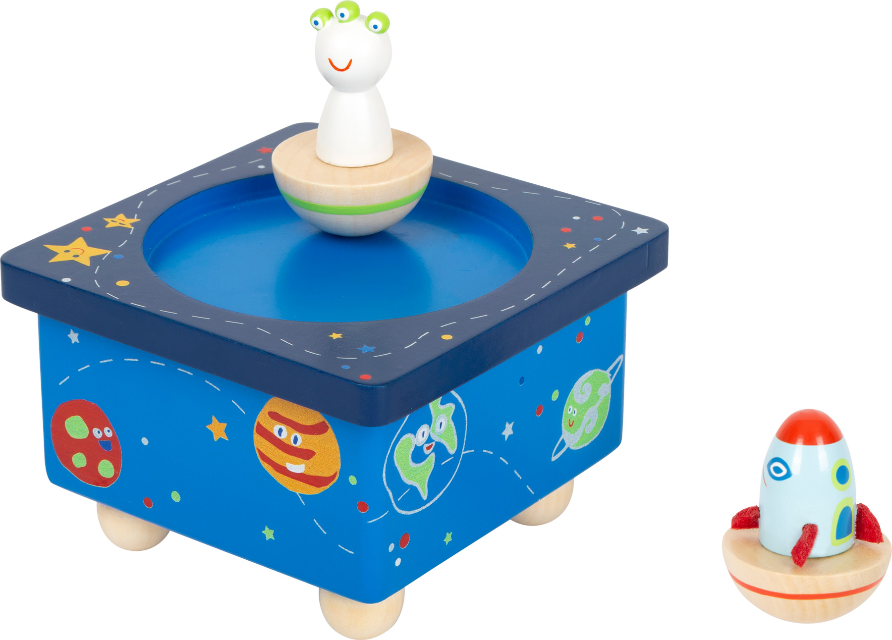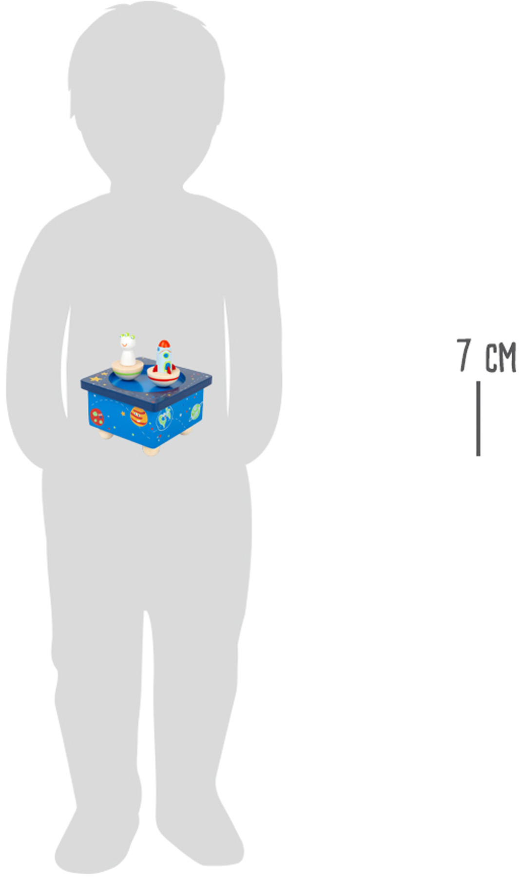 Freier Flug durch die Umlaufbahn! Diese Spieluhr aus Holz im angesagten Weltraum-Design spielt die traumhafte Melodie "Twinkle Twinkle Little Star", während sich die Rakete und der Außerirdische auf der Tanzfläche zum Klang der Musik umkreisen. Da versinken kleine Astronauten garantiert sofort in schwerelose Träume! Eintauchen in eine andere Galaxie - mit dieser außergewöhnlichen Spieluhr kein Problem! Die Spieluhr aus der Produktgruppe „Space“ besticht durch die niedlichen Details in Weltall-Optik. Durch die leichte Handhabung kann die Spieluhr auch von Kindern selbstständig bedient werden.