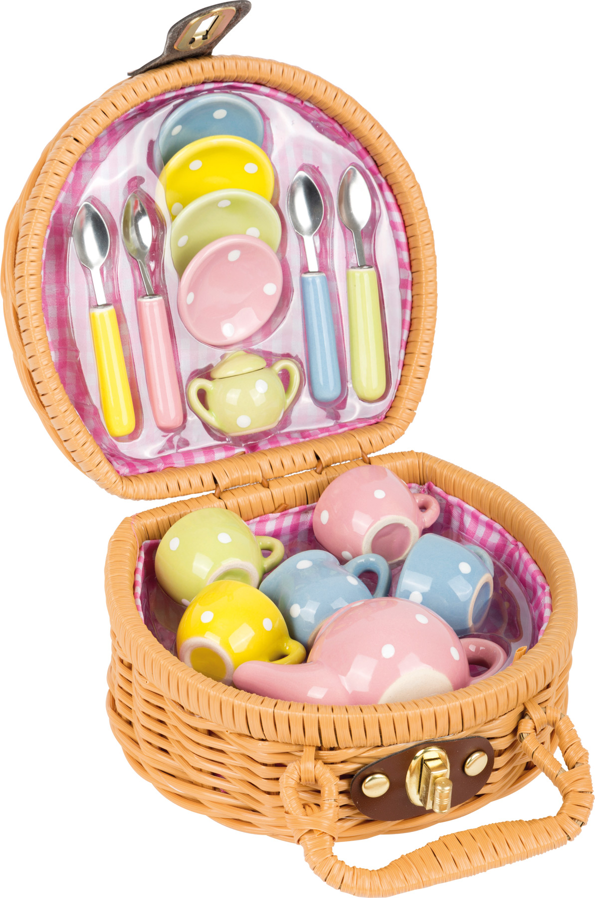 Dieser Picknickkoffer ist für kleine Puppenliebhaber gedacht, die mit ihren Püppchen oder Kuscheltieren eine lustige Teeparty veranstalten wollen. Vier farbenfrohe Tassen, vier Teller, vier Löffel, eine Zucker- und Milchdose sowie eine Teekanne sind in diesem Korb aus Kunststoffgeflecht enthalten. Der Korb lässt sich überallhin mitnehmen und ist, mit einer Picknickdecke, ideal für grüne Wiesen oder den eigenen Garten.