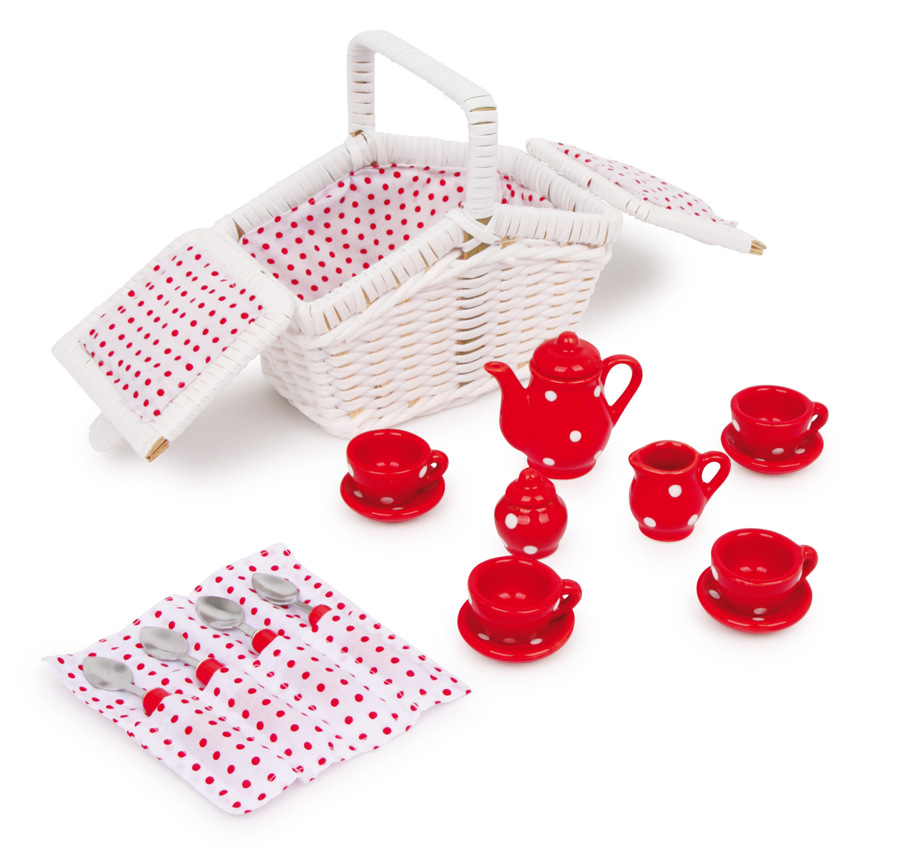 Dieser weiße Picknickkorb ist für kleine Puppenmamis gedacht, die mit ihren Püppchen oder Kuscheltieren schon immer mal eine lustige Teeparty veranstalten wollten. Das Zubehör kann wunderbar im Korb aus Kunststoffgeflecht transportiert werden. Ein niedliches Mini-Picknick-Set im Klappkorb. Drin sind Kanne, Tassen, Teller, Milch- und Zuckerbehälter aus Keramik und vier kleine Löffel mit glasierten Keramikgriffen in einer hübschen Stoffserviette. Liebevoll kontrastierendes Pünktchen-Dekor.