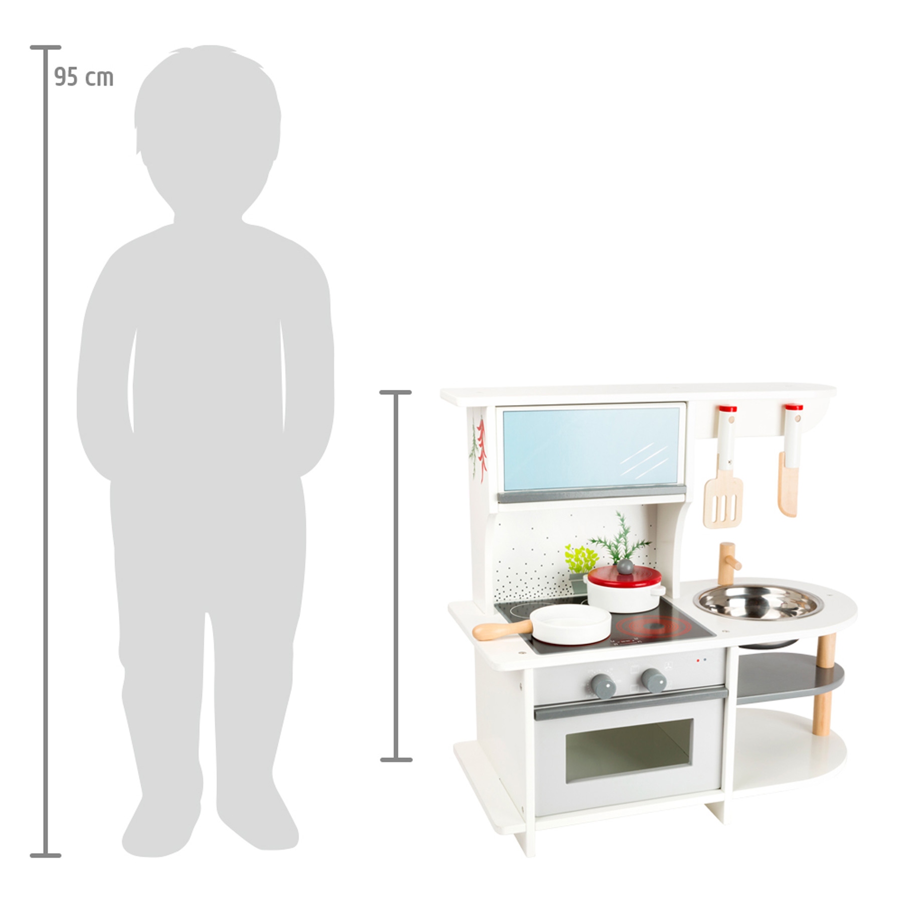 Alle kleinen Köche an den Herd. Hier kommen hungrige Mäuler auf ihre Kosten! Der Backofen ist mit einer aufklappbaren Tür ausgestattet, die Temperaturregler klicken beim Drehen und das Waschbecken aus Metall ist herausnehmbar. Mit den passenden Kochutensilien können wie in einer richtigen Küche allerlei Leckereien spielerisch zubereitet und gekocht werden. Der Küchenschrank bietet Platz für die leckeren Lebensmittel aus dem Tante Emma-Laden. So lässt sich alles platzsparend verstauen. Eine Kinderküche, die auf kleinen Spielflächen ganz groß rauskommt.