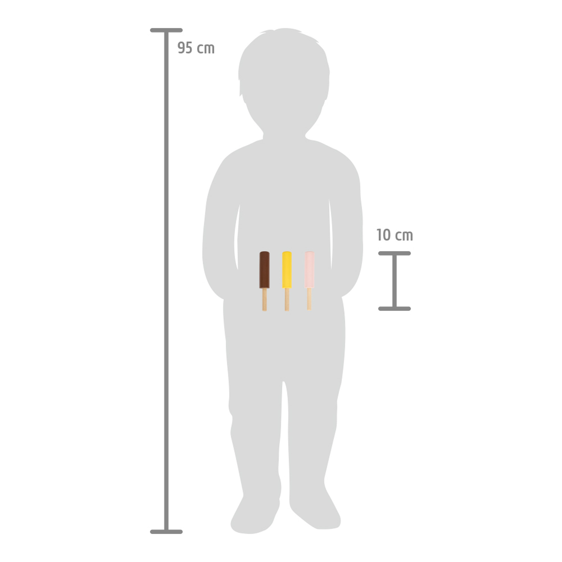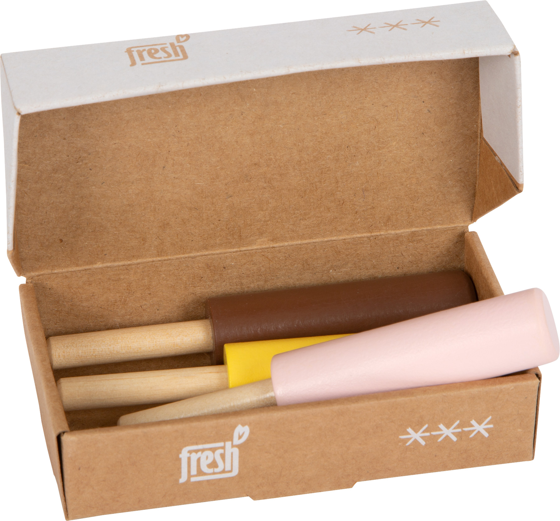Zeit für Eis! Mit diesem 3er-Set Milcheis am Stiel aus Holz verwandelt sich jeder Kaufladen in eine kleine Eisdiele! Das Trio eignet sich perfekt für realitätsnahes Spielen in Kaufladen und Spielküche. Das Stieleis in den Variationen Erdbeere, Vanille und Schokolade liegt gut verstaut in einer umweltfreundlichen Klappschachtel aus Naturkarton. Dank einfacher Abbildung auch für kleine Kinder, die noch nicht lesen können, leicht zu verstehen. Leckeres Eis ist zu jeder Jahreszeit der Hit im fantasievollen Rollenspiel in Kaufladen und Kinderküche! Zusammen mit weiteren Spiellebensmitteln der Produktlinie „fresh“ ist langlebiger Spielspaß mit Spiellebensmitteln aus Holz garantiert. Die Produktlinie „fresh“ hält mit dem Eisständer „fresh“ (12232) und der Eistheke „fresh“ (11815) weitere Spielsets rund ums Thema Eiscreme bereit.