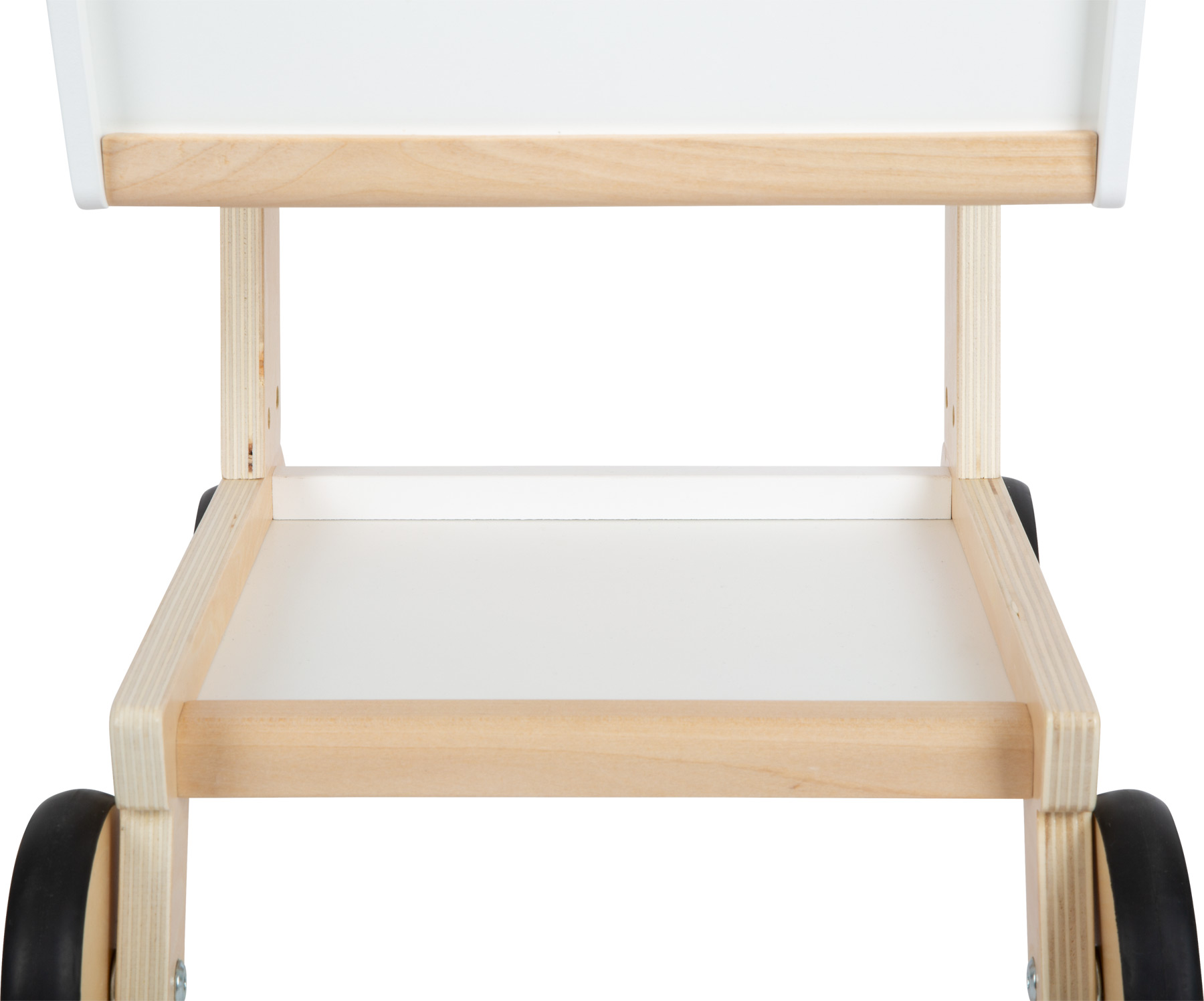 Mit diesem Spiel-Einkaufswagen aus stabilem Holz und gummierten Rädern wird der Besuch im Kaufladen zum Einkaufserlebnis. Wie im echten Supermarkt wird der magnetische Einkaufschip in die Halterung gesteckt und schon kann es mit dem Großeinkauf losgehen! Der geräumige Korb des Wagens bietet auch dann genügend Platz, wenn viel auf der Einkaufsliste steht – zusätzlichen Stauraum, z.B. für Getränkekisten, bietet die Ablagefläche unter dem Korb. Im beweglichen Kindersitz fahren Teddy, Puppe & Co. bequem mit und in der kleinen Tasche am Einkaufswagen ist das Spielgeld für den Einkauf sicher verstaut. Die Aussparung an der Wagenfront dient zum Aufhängen einer Einkaufstasche. Die Gummiräder hinterlassen keine Spuren auf empfindlichen Böden und machen kaum Lärm – so wird der besonders stabil stehende Einkaufswagen bei allen Familienmitgliedern zum beliebten Begleiter für das Rollenspiel im Kaufladen. Extra leicht zu schieben, mit handschmeichlerischem Holzgriff! Tipp: Auch zum schnellen Aufräumen im Kinderzimmer ist der moderne, genderneutrale Shopping-Begleiter ideal!