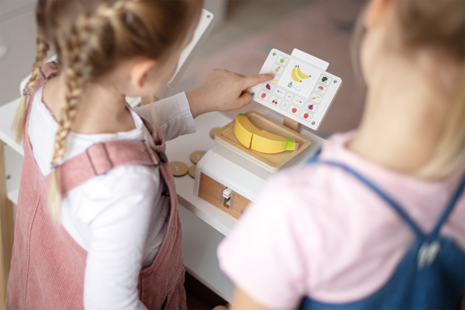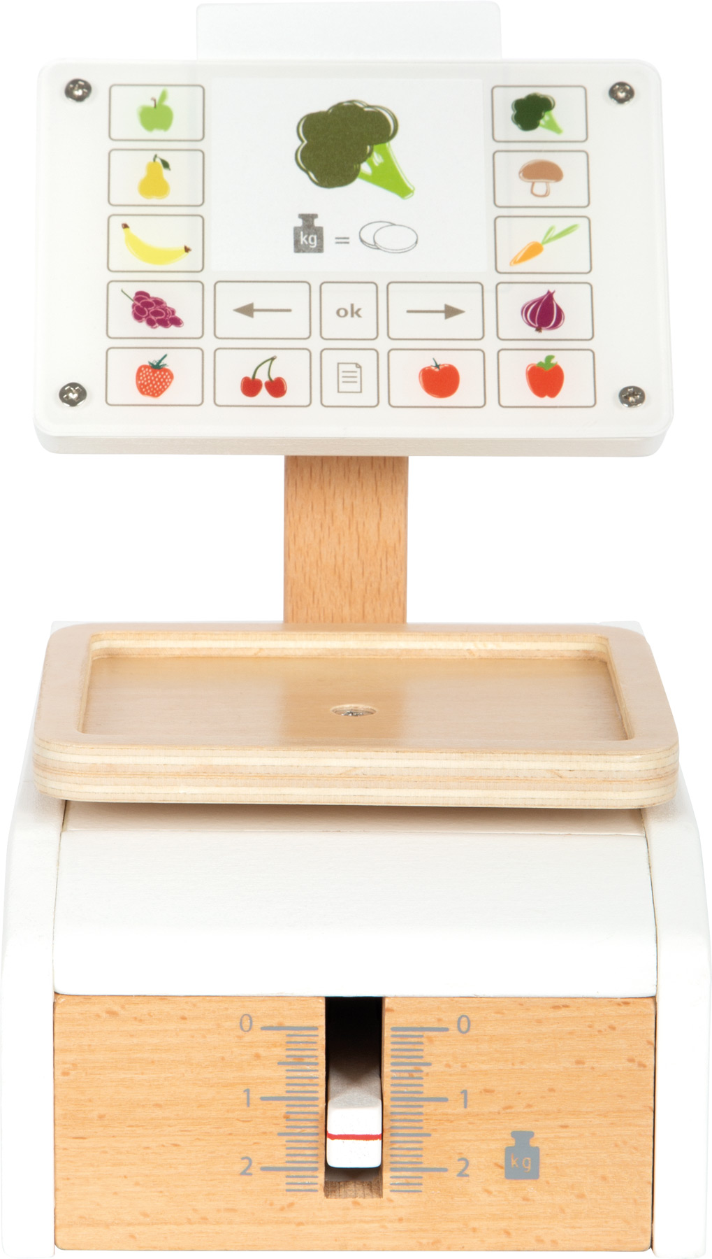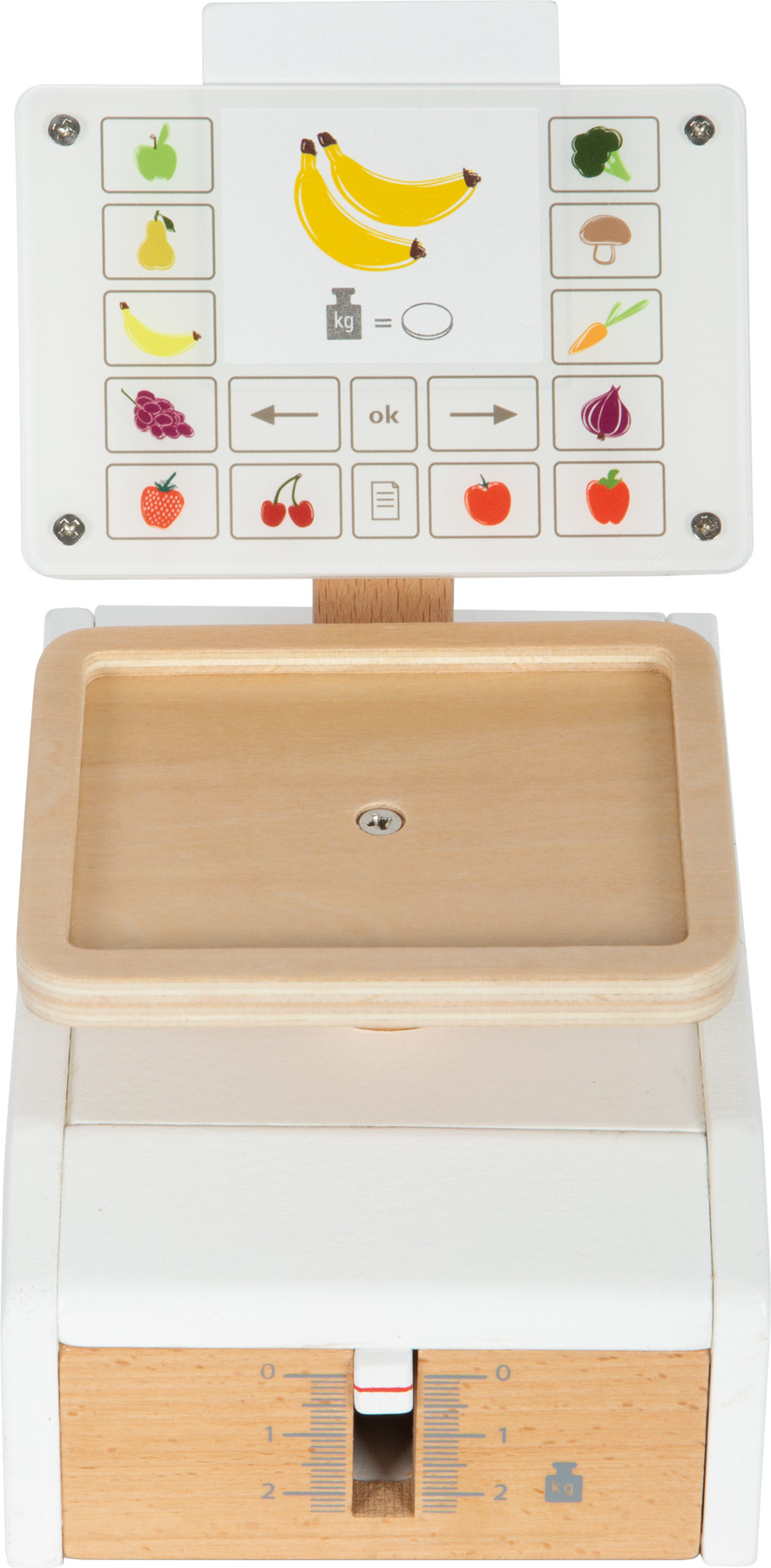 Abwiegen wie im Supermarkt! Diese Kinderwaage aus Holz mit großer Wiegefläche ist das richtige Zubehör, um im Kaufladen oder in der Kinderküche Spiellebensmittel abzuwiegen. Dabei sorgt der integrierte Federmechanismus für ein besonders realistisches Spielvergnügen, denn der bewegliche Zeiger und die Waagschale bewegen sich auf und ab, wenn etwas auf die Waage gelegt wird. Der große „Monitor“ ist mit einer hochwertigen Acryl-Glasscheibe versehen, die mit verschiedenen Bedienfelder und Obst- und Gemüse-Abbildungen hinterdruckt ist. Sechs beidseitig bedruckte Produktkarten mit Abbildungen von Obst und Gemüse komplettieren die Rollenspiel-Waage und können im mittleren Bereich des „Displays“ von oben eingeschoben werden. Diese Spielwaage aus der Produktlinie „fresh“ darf in einem gut sortierten Kaufmannsladen nicht fehlen! Das Wiegen trainiert den Umgang mit einer Waage und vermittelt spielerisch ein Gefühl für Gewichte, die durch die bewegliche Waagschale visuell erlebbar gemacht werden. Damit Kinder ebenso ein Gefühl für unterschiedliche Preise vermittelt bekommen, sind die Lebensmittelkärtchen mit Abbildungen von Geldmünzen versehen – je mehr Münzen abgebildet sind, desto teurer ist das Kilo des gewogenen Obstes oder Gemüses. Die hochwertige Verarbeitung mit robustem Holz und Acrylglas macht die Kaufladen-Waage zu einem echten Hingucker im Kinderzimmer, der langanhaltenden Spielspaß verspricht!