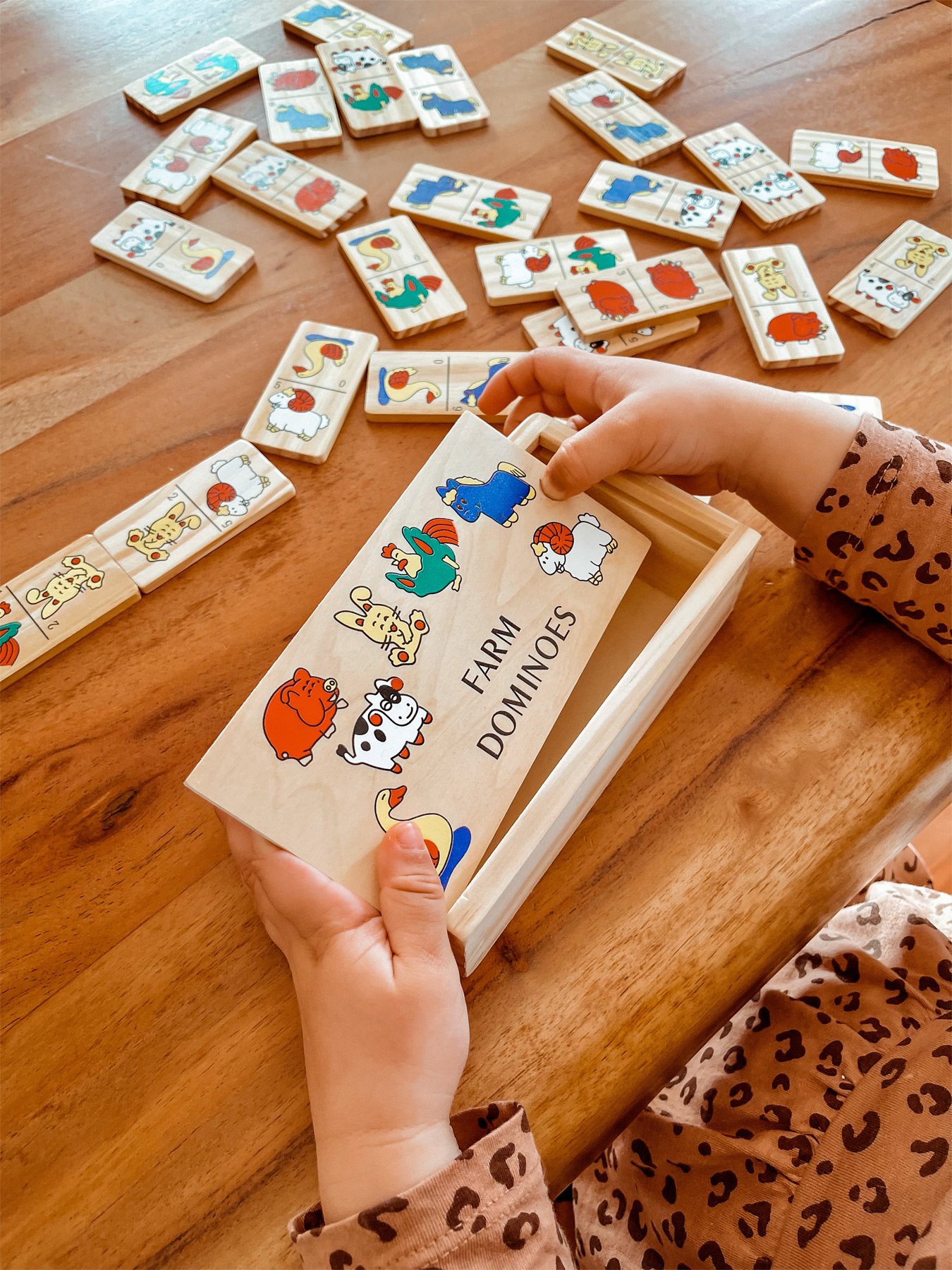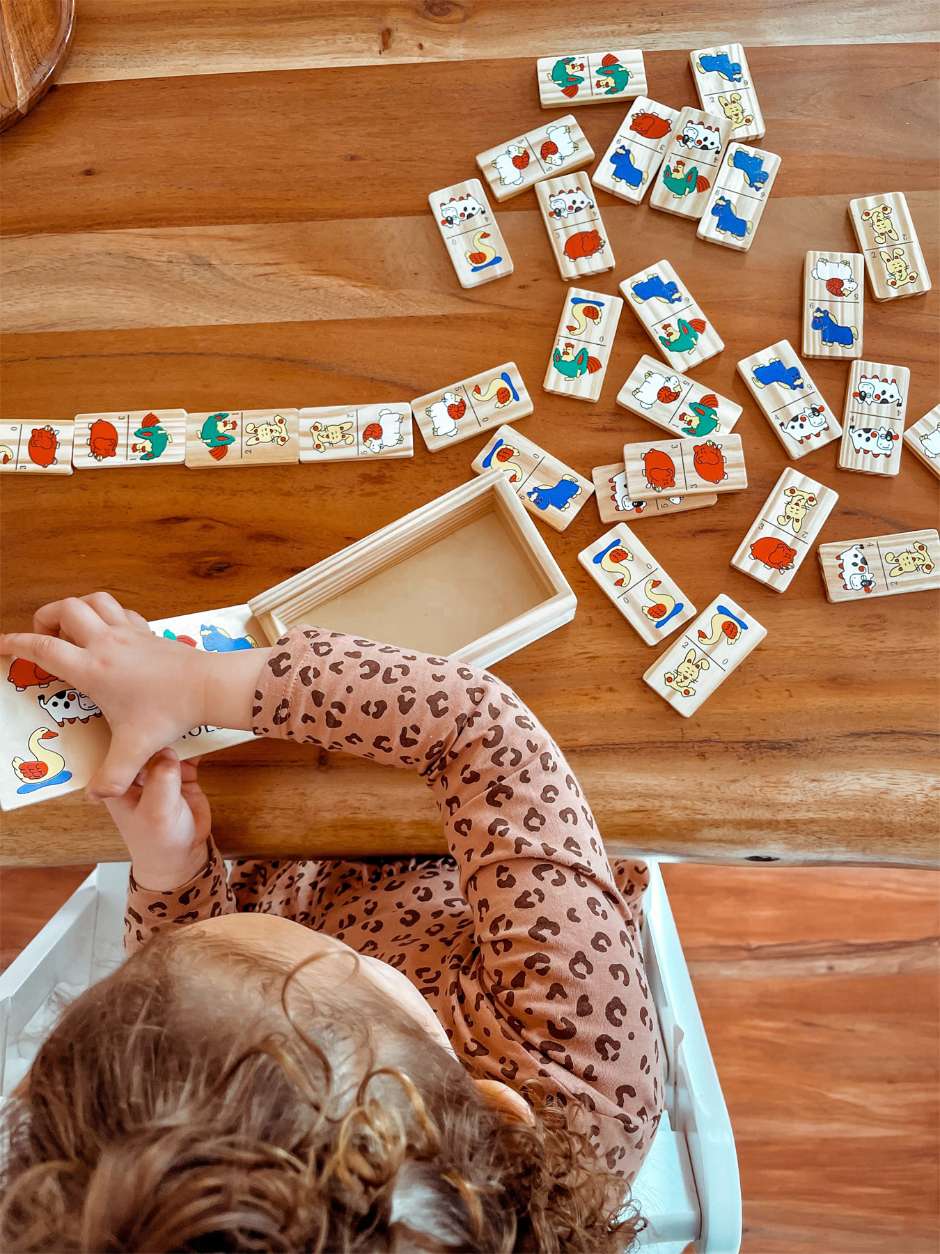 Wer schafft es, alle Motive loszuwerden? Lustige Tiermotive möchten zu ihren bildlichen Partnern. Die Dominosteine aus Holz lassen sich gut greifen und schulen ganz spielerisch die Feinmotorik. Mit Holzbox. Der Klassiker mit niedlichen Tiermotiven.
