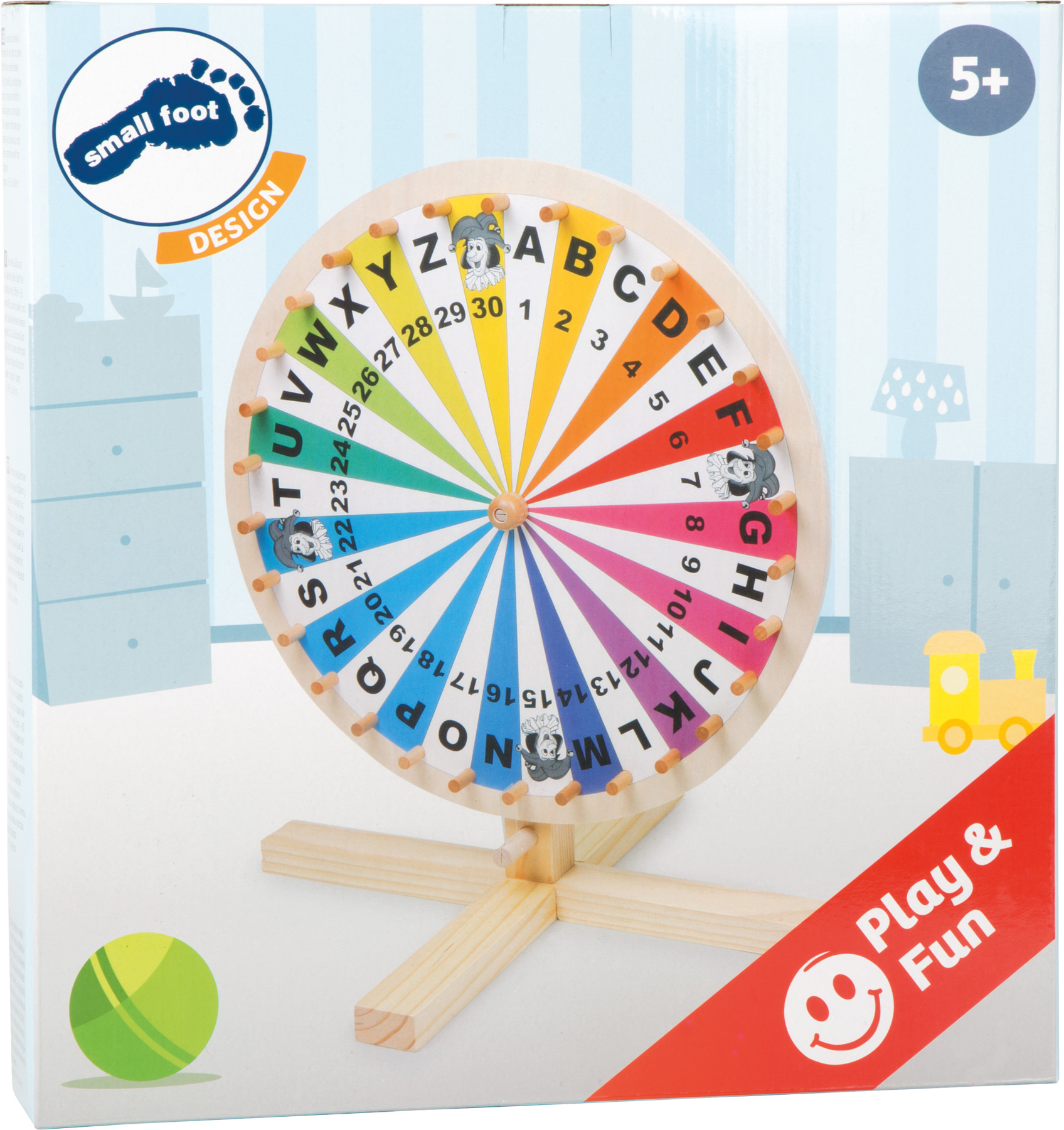 Ein tolles Zubehör für Lotteriespiele, Wortspiele oder erdachte Spiele ist dieses Glücksrad mit Ziffern von 1 bis 30, Buchstaben von A bis Z und vier Jokern! Auf dem standsicheren Massivholzständer kann das Rad sich gut drehen und die einzelnen Felder sind mit Holzstiften versehen, welche fröhlich an dem „Stopper“ klappern.