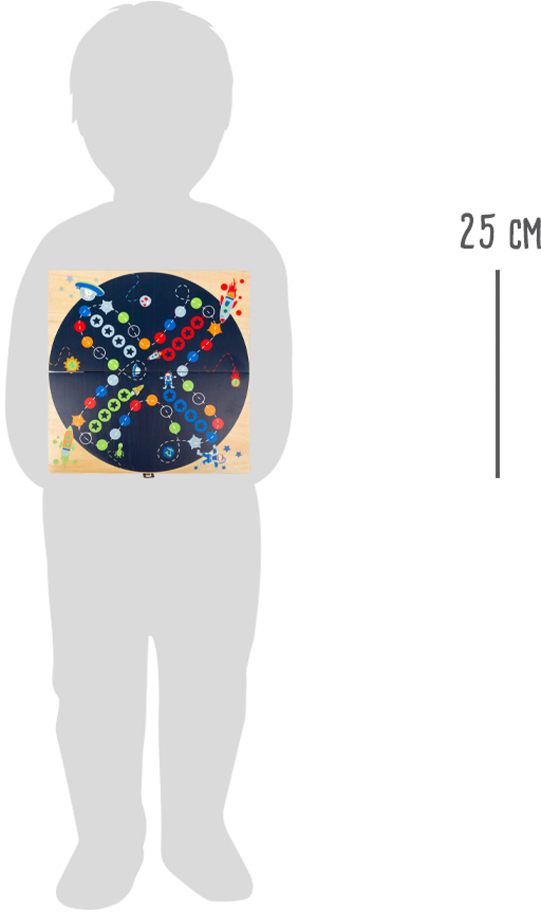 Der Weltraum als Spielbrett! Mit diesem Ludo aus hochwertigem Holz wird dieser Traum kleiner Astronauten wahr. Hier laufen Weltraumpiloten, fliegen Raketen und wandeln Außerirdische um die Wette. Dabei müssen sie versuchen, ihre Sternenfelder mithilfe eines Zahlen- oder Farbwürfels zu erreichen. Ein klassisches Ludo im angesagten Design, das dank des Farbwürfels auch schon für kleinere Kinder geeignet ist! Wer als Erster seine Sterne belegt hat gewinnt. Ein spannendes Spiel aus der Produktgruppe "Space", das Kinder ganz nebenbei im Zahlen- und Farbverständnis schult. Durch den praktischen Klippverschluss lässt sich das Spiel ganz einfach transportieren.