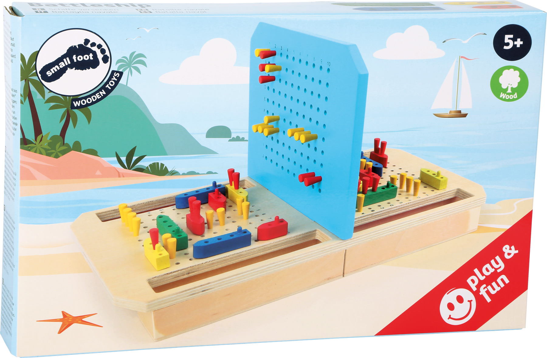 Treffer – versenkt! Das ganz aus Holz gefertigte "Schiffe versenken" hat nicht nur steckbare Schiffstypen, sondern auch die entsprechenden „Bomben“ und kleine Kegel, die an den vom Gegener angesagten Stellen ins Spielbrett (oder das entsprechende Schiff...) gesteckt werden. Absoluter Klassiker mit Spannung über viele Stunden.