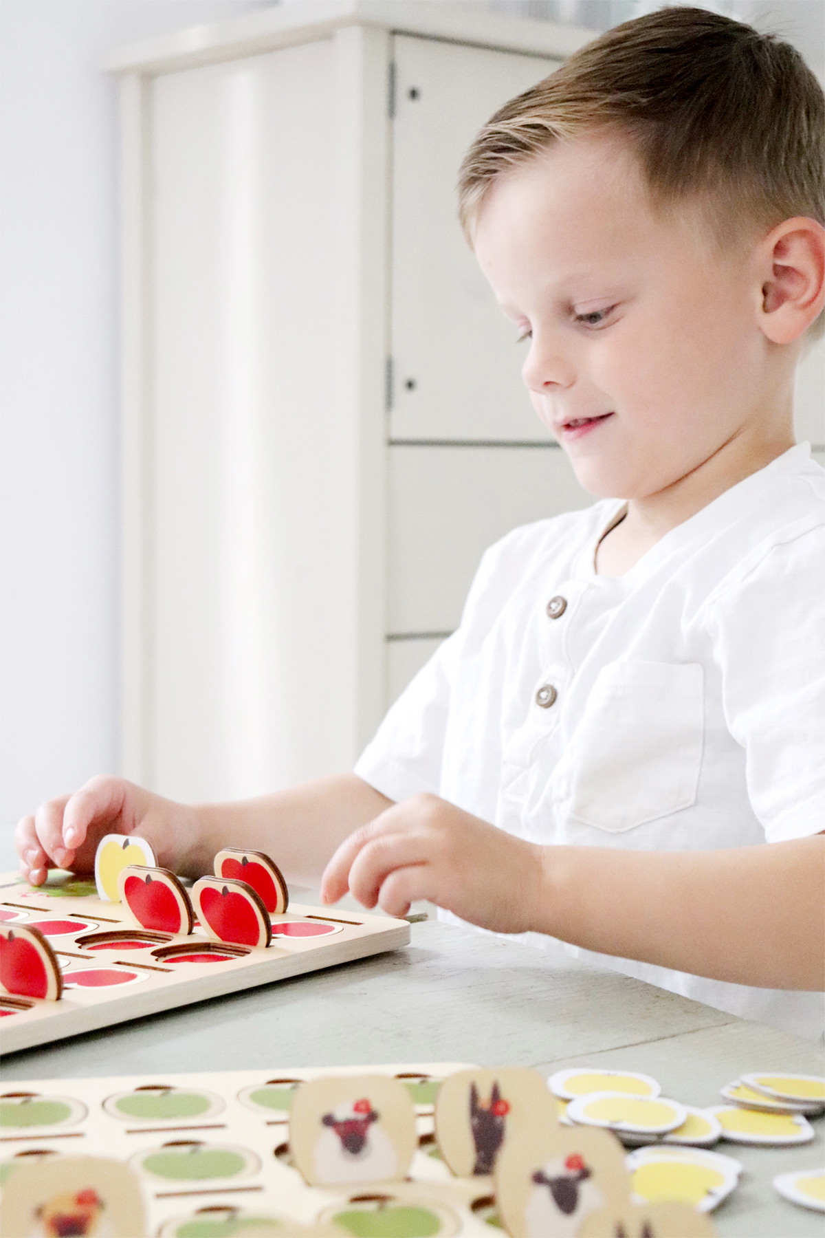 Wer hat die Äpfel gemopst? Bei dem beliebten Ratespiel für die ganze Familie ist eine gute Beobachtungsgabe wichtig, denn es gilt, mit geschickten Fragen die gesuchte Figur der „4 Friends“ schnell zu erkennen! Ein Spieleklassiker aus robustem Holz in besonders kindgerechtem Design! Mit zwei Spielbrettern zum Aufstellen der Rate-Plättchen und 22 Pappkarten zum Ziehen der zu erratenden Figur. 2-in-1: Das Knobelspiel ist auch als klassisches Memo zu verwenden! Mit hochwertigem Spielkarton zur Aufbewahrung. Olga die Kuh und Heinz der Hahn versuchen zu erraten, wer die Äpfel von der Weide stibitzt hat. Doch die beiden Verdächtigen haben sich zur Tarnung gut verkleidet! Das beliebte Fragespiel eignet sich ideal dazu, um mit Kindern das Thema Gemeinsamkeiten und Unterschiede spielerisch zu erörtern. Das Gesellschaftsspiel mit seinen sehr einfachen Spielregeln begeistert Klein und Groß gleichermaßen bei schnellen Spielrunden und fördert nebenbei Kombinationsfähigkeit sowie Konzentration.
