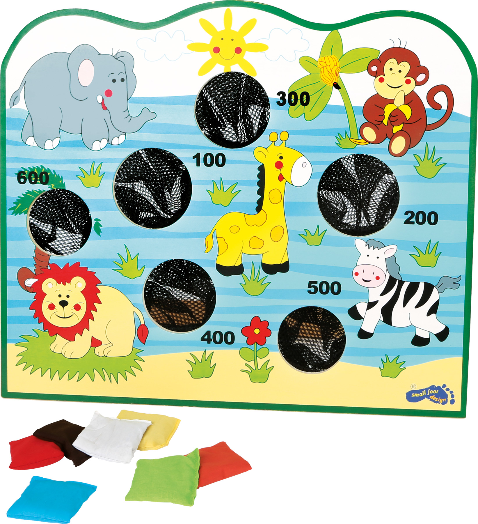 Jahrmarktstimmung im Kinderzimmer! Das kompakte Wurfspiel mit süßen Afrika-Tieren erfordert zielgenaues Werfen. Die kleinen Sandsäckchen müssen in die verschieden großen Löcher mit unterschiedlich hoher Punktzahl geworfen werden. Schult Hand-Augen-Koordination und Motorik! Dieser kompakte Artikel benötigt wenig Platz und ist ideal fürs Spielen im Zimmer geeignet!