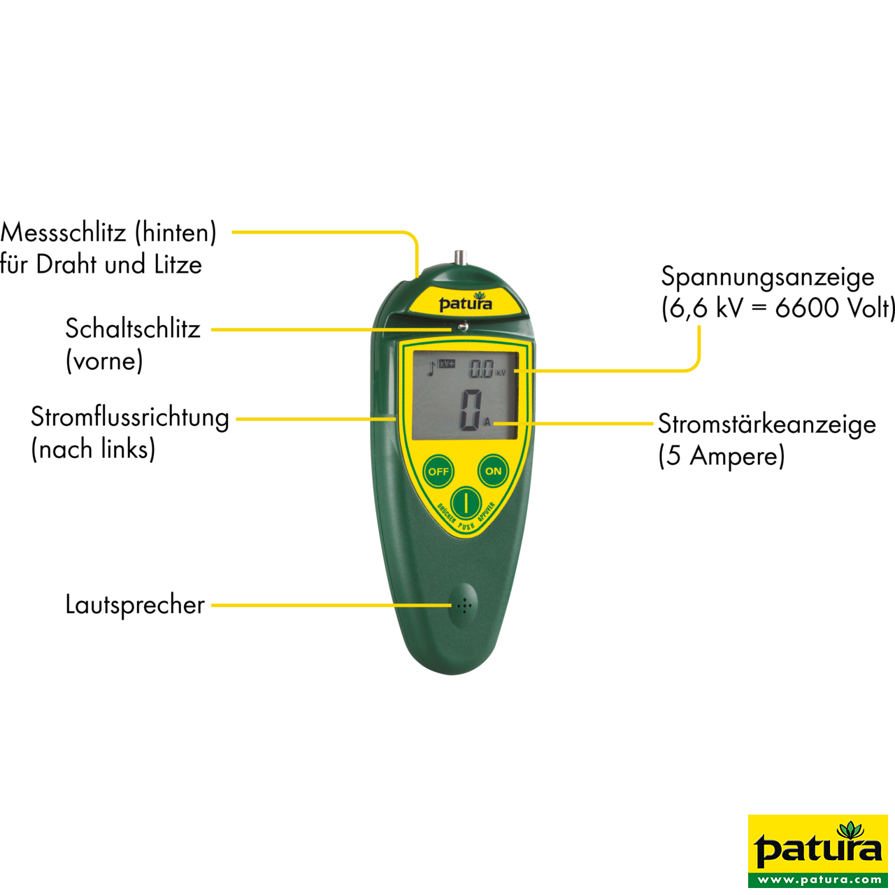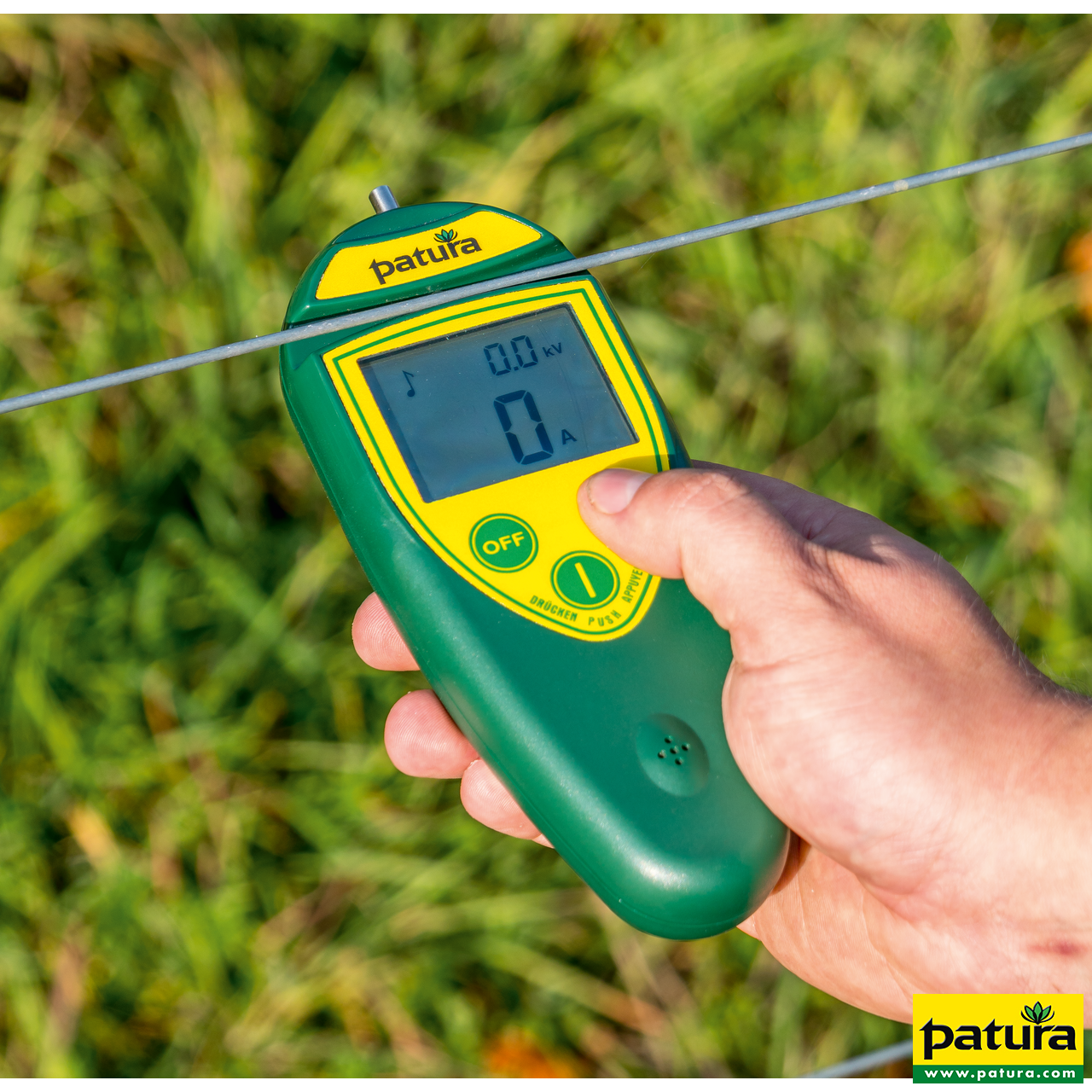 Zur Fehlersuche wird die PATURA Fernbedienung auf den Zaundraht gedrückt und zeigt Spannung, Stromstärke und Stromflussrichtung (mittels Pfeil) an. Auf diese Weise lässt sich ein Kurzschluss schnell finden. Nach der Fehlerstelle geht die Stromstärke gegen 0 und der Richtungspfeil verschwindet.