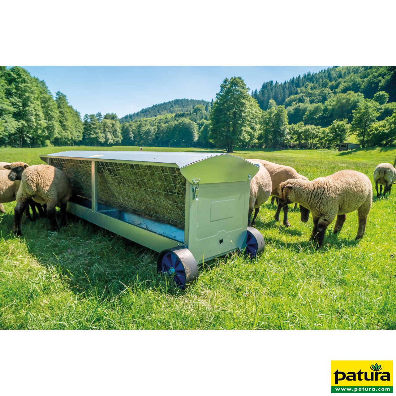 Für die Heufütterung an Schafen bietet PATURA verschiedene Möglichkeiten. Mit der fahrbaren Heuraufe kann Futter individuell, im Stall als auch auf der Weide, vorgelegt werden. Die Heuraufe steht in zwei Längen zur Verfügung. Das Fahrwerk mit den vier großen Rädern erleichtert das Rangieren auch auf unebenem Untergrund. Das Futter kann einfach durch das Gitter mit einer Maschenweite von 7,5 x 7,5 cm herausgezupft werden, der darunter liegende Trog fängt herunterfallendes Futter auf.