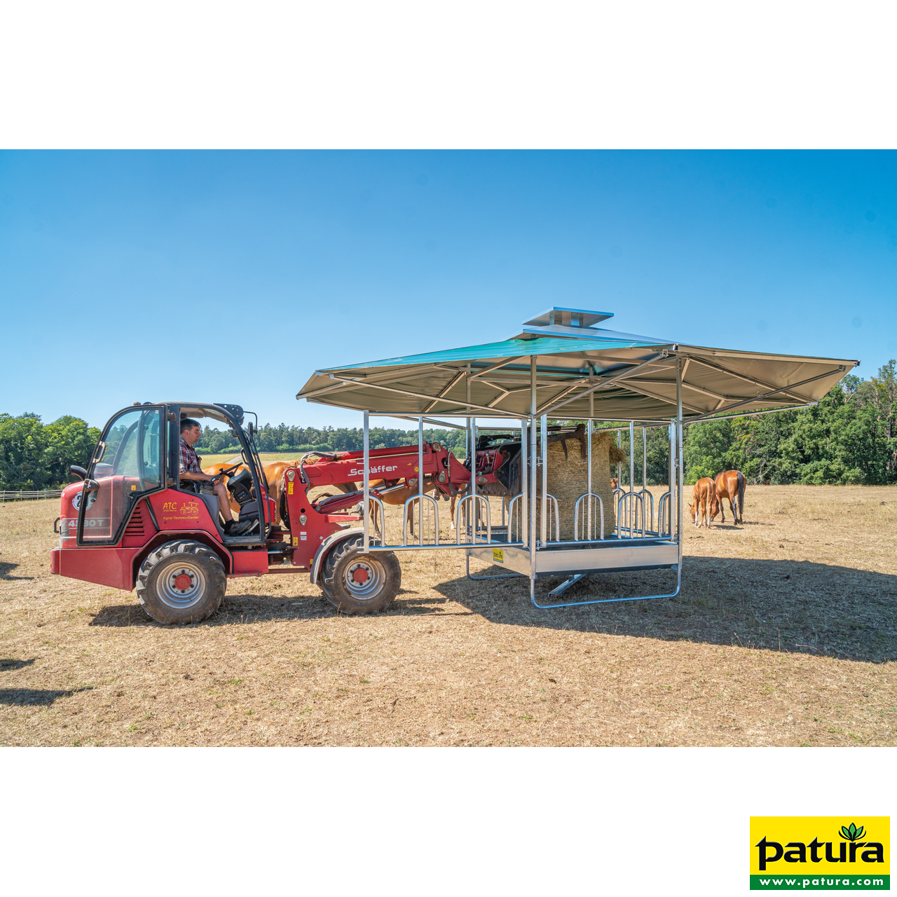 Für den problemlosen Transport der gesamten Raufe kann die gewohnte Dreipunktanhängung verwendet werden. Die Beschattungselemente können für Straßenfahrten oder für das Umsetzen von Weide zu Weide eingeklappt werden.