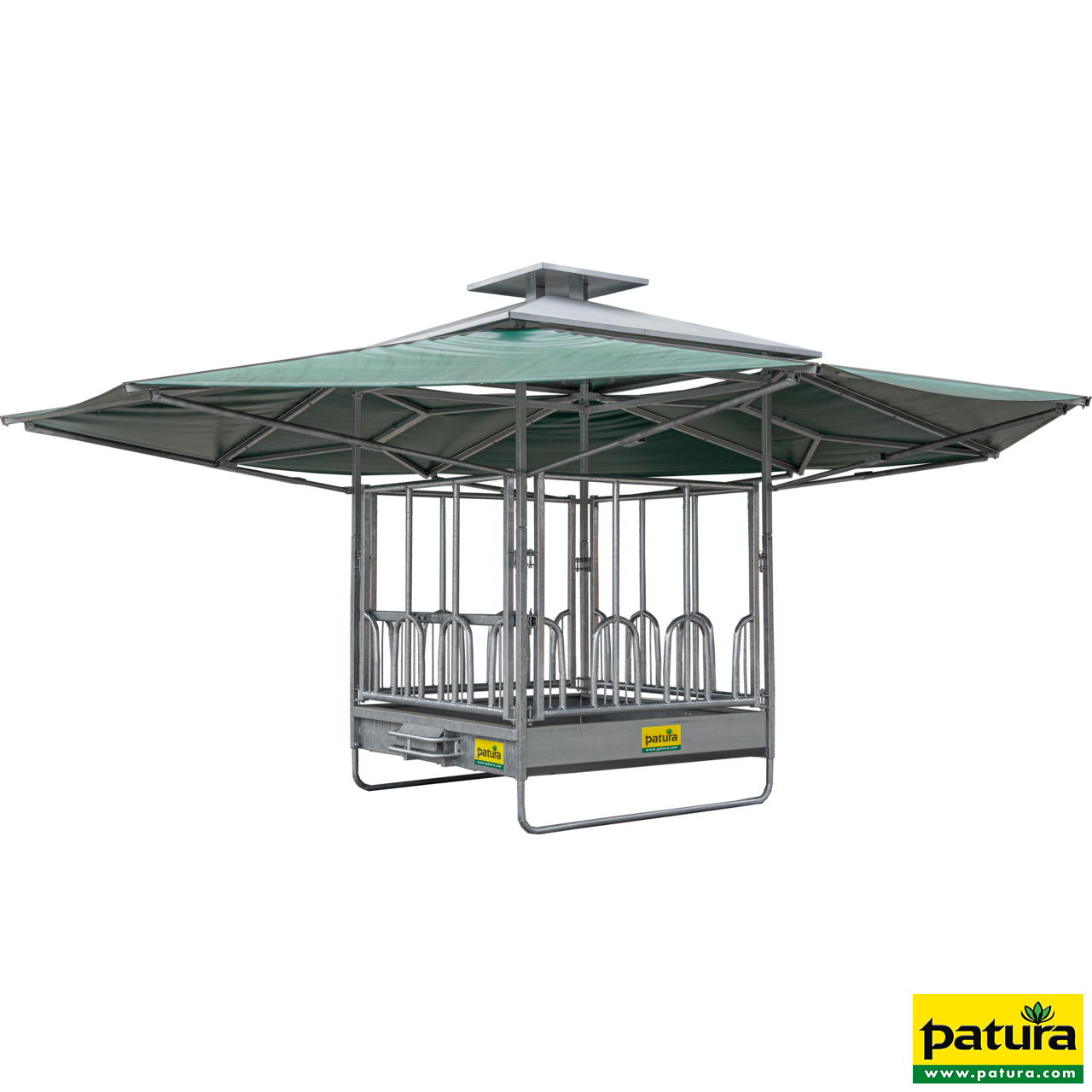 Die neue Klima-Raufe basiert auf den bewährten Profi-Viereckraufen. Das Dach für die Klima-Raufe lässt sich mit allen sechs Fressgittervarianten kombinieren. Diese innovative Dachkonstruktion wird direkt auf den Grundrahmen der Raufe aufgebaut. Aufgrund der speziellen Bauweise bietet die Raufe eine sehr große Dachfläche (36m²) und sorgt dank des eingebauten Kamines für einen angenehmen Kühlungseffekt. Durch die Kaminwirkung wird immer eine Luftbewegung erzeugt, die ein angenehmes Klima für die Tiere schafft und zusätzlich lästige Fliegen fernhält. Für Rinder und Pferde entsteht so ein attraktiver Platz zur Futteraufnahme mit gleichzeitigem Schutz vor direkter Sonneneinstrahlung und Regen.