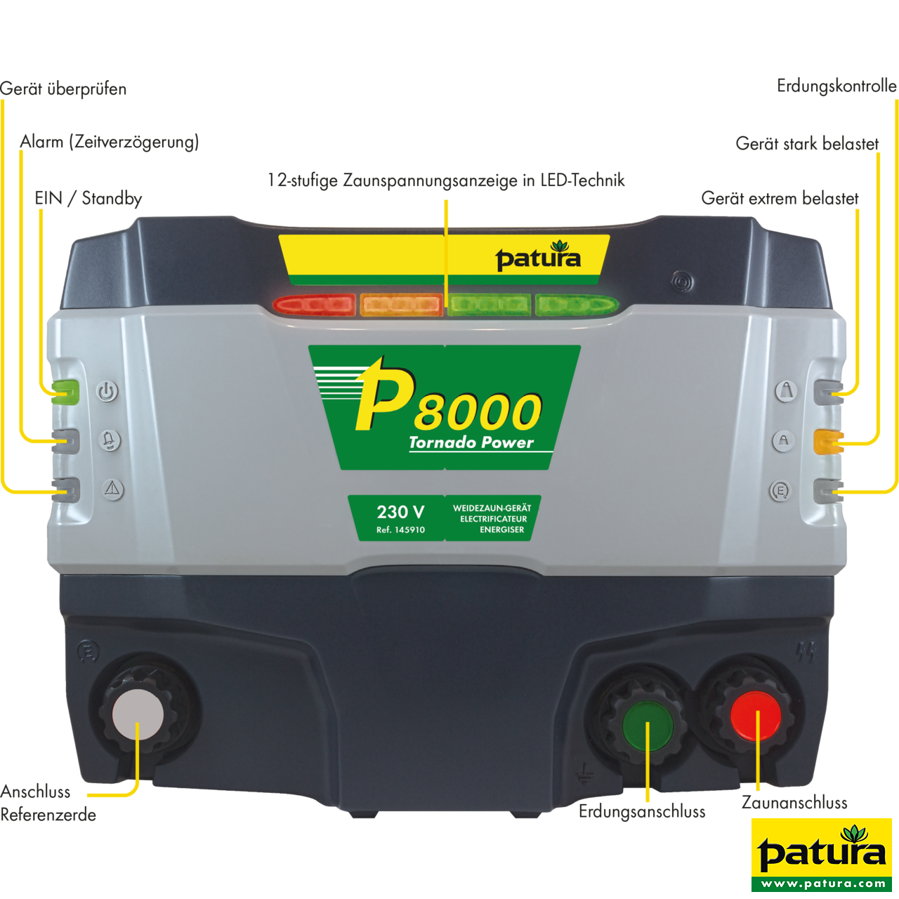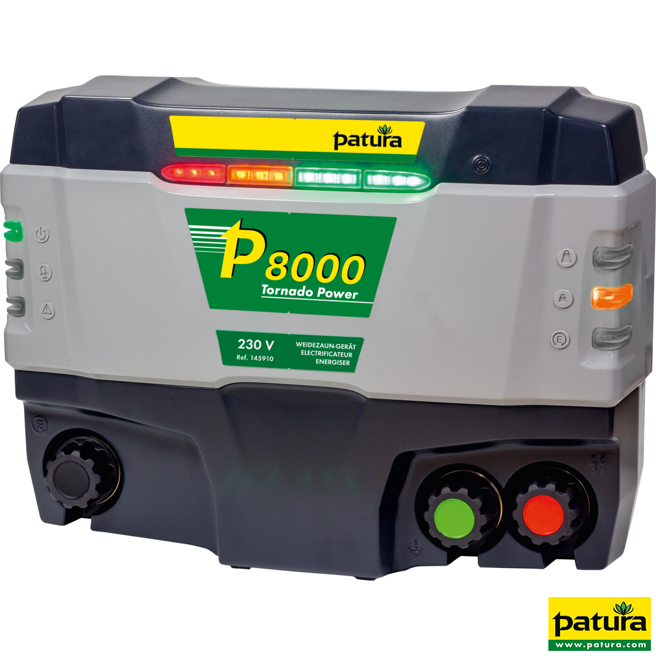 Mit 15 Joule Impulsenergie höhere Spannungen erzielen als das Vorgängermodell mit 37 Joule: mit dem PATURA P 8000 Tornado Power ist dies möglich. Das besondere, neuartige Netzteil zur Stromversorgung sorgt für die nötige Isolierung zwischen Stromnetz und Zaun. Dank dieser patentierten Technologie werden selbst unter außergewöhnlichen Belastungen höchste Spannungen erreicht, so dass das Gerät ideal zur Verwendung bei extremen Zaunlängen oder großen Herdenschutzzäunen geeignet ist. Die Leistungsfähigkeit der Erdung lässt sich mittels Referenz-Erdungsanschluss problemlos überprüfen, Fehler in der Erdung werden gut sichtbar an der entsprechenden Kontrollleuchte angezeigt. Dank der Isolierung zwischen Zaun und Stromnetz ist dieses deutlich besser vor Blitzeinschlägen in den Zaun geschützt.