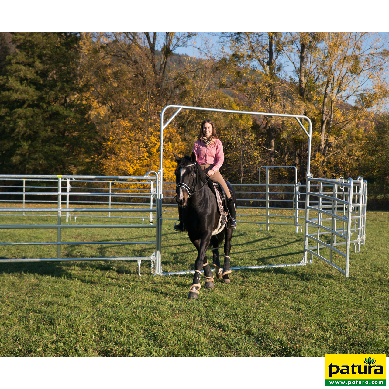 Dank des zweifach höhenverstellbaren Rahmens sowohl im Eintreibebereich einer Behandlungsanlage für Rinder ideal, als auch für Reitplatzeingänge nutzbar. Die Durchgangshöhe kann von 2,20 m auf 2,70 m erhöht und damit auch reitend passiert werden. Dank der Einhandbedienung kann das Tor vom Pferd aus geöffnet und auch wieder geschlossen werden.