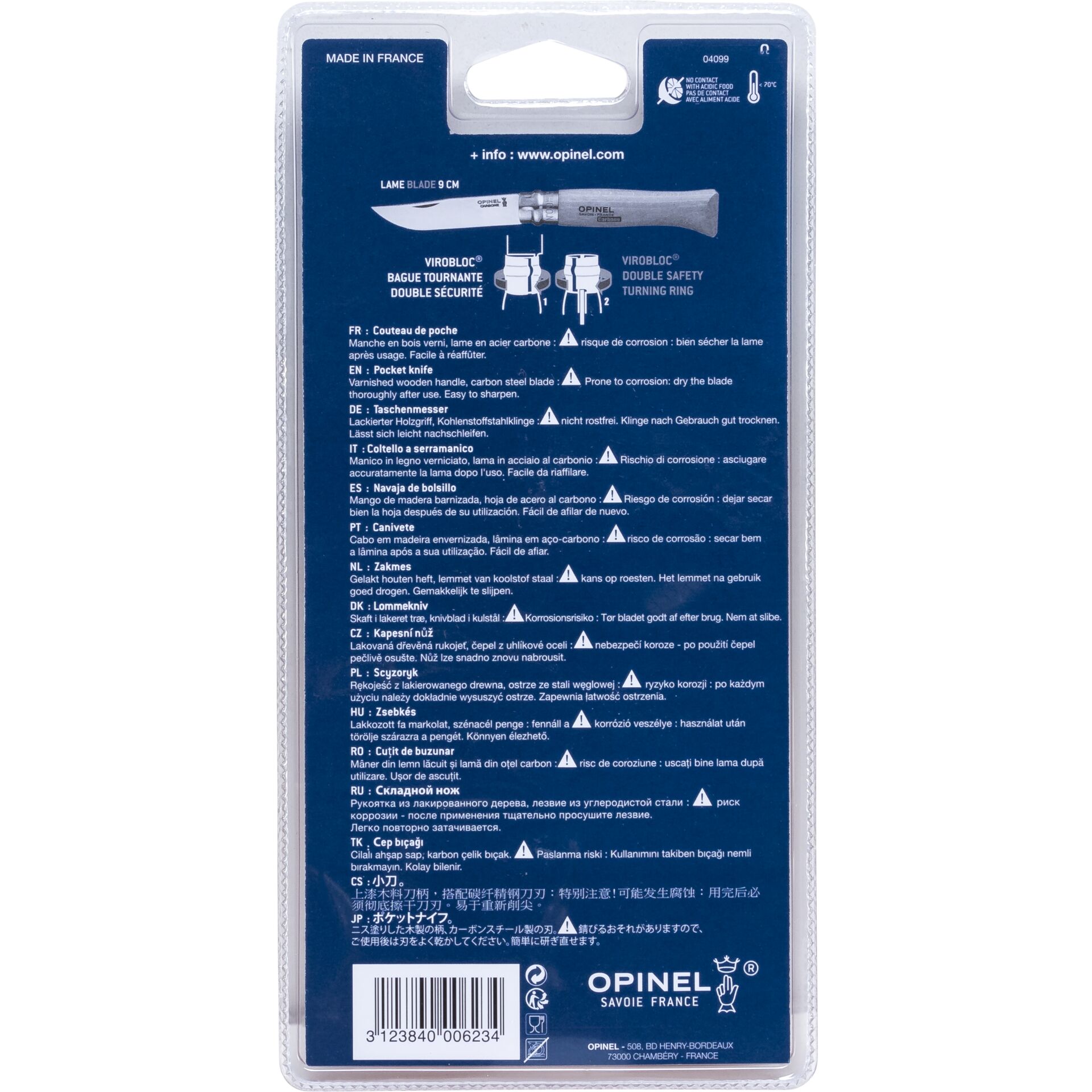 Der Griff des N°09 Carbon ist aus französischer Buche gefertigt, dieses Holz weist eine homogene Maserung auf und ist aufgrund seiner Härte sehr langlebig und robust. Mit dem von Marcel Opinel entwickelten Virobloc-Sicherheitsring lässt sich die Klinge sowohl im ein- als auch im ausgeklappten Zustand arretieren, das sorgt für zusätzliche Sicherheit und schützt vor Verletzungen.