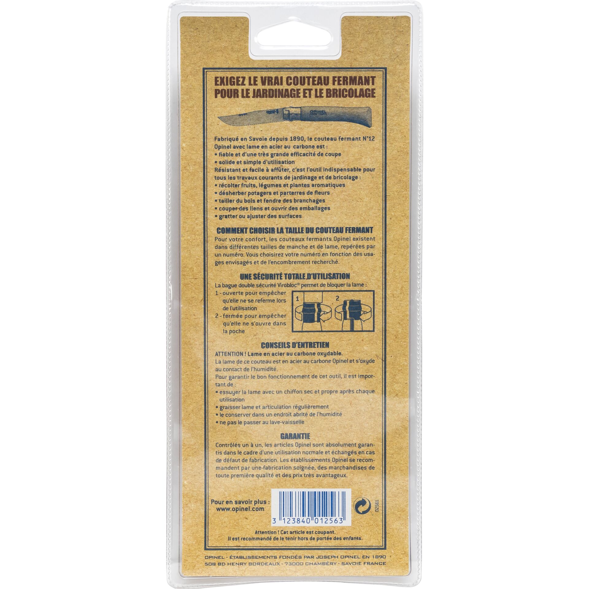 Der Griff des N°12 Carbon ist aus französischer Buche gefertigt, dieses Holz weist eine homogene Maserung auf und ist aufgrund seiner Härte sehr langlebig und robust. Mit dem von Marcel Opinel entwickelten Virobloc-Sicherheitsring lässt sich die Klinge sowohl im ein- als auch im ausgeklappten Zustand arretieren, das sorgt für zusätzliche Sicherheit und schützt vor Verletzungen.