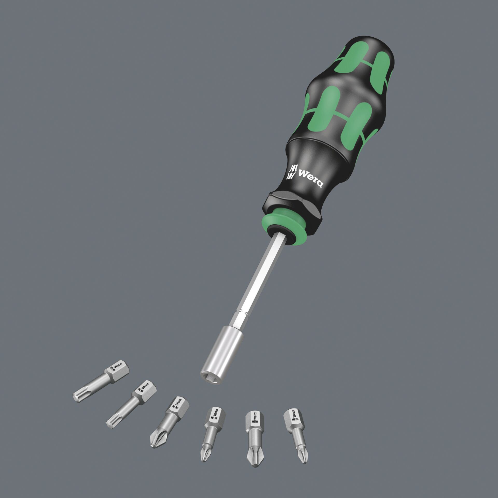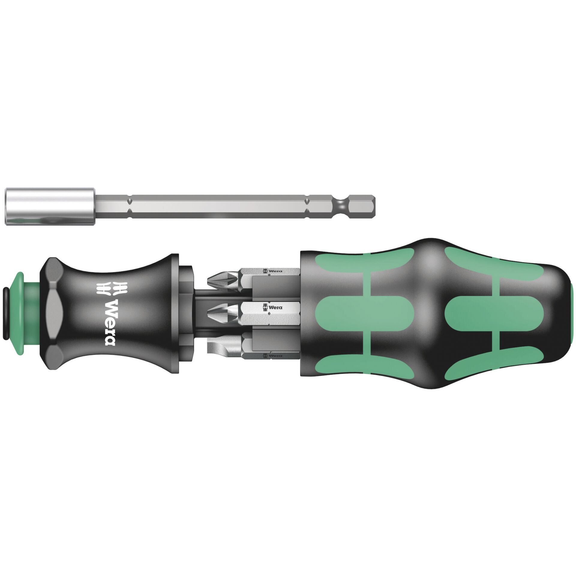Wera Kompaktwerkzeug mit mehrkomponentigem Kraftform Griff für hohe Arbeitsgeschwindigkeiten und besonders ergonomisches Verschrauben. Integriertes Bit-Magazin im Griff, in dem 6 Bits aufbewahrt werden können. Die Bajonett-Klinge kann für beengte Schraubsituationen eingefahren werden. Für den Maschinenbetrieb kann sie auch entnommen werden. Mit starkem Dauermagnet für sicheren Sitz des Bits.
