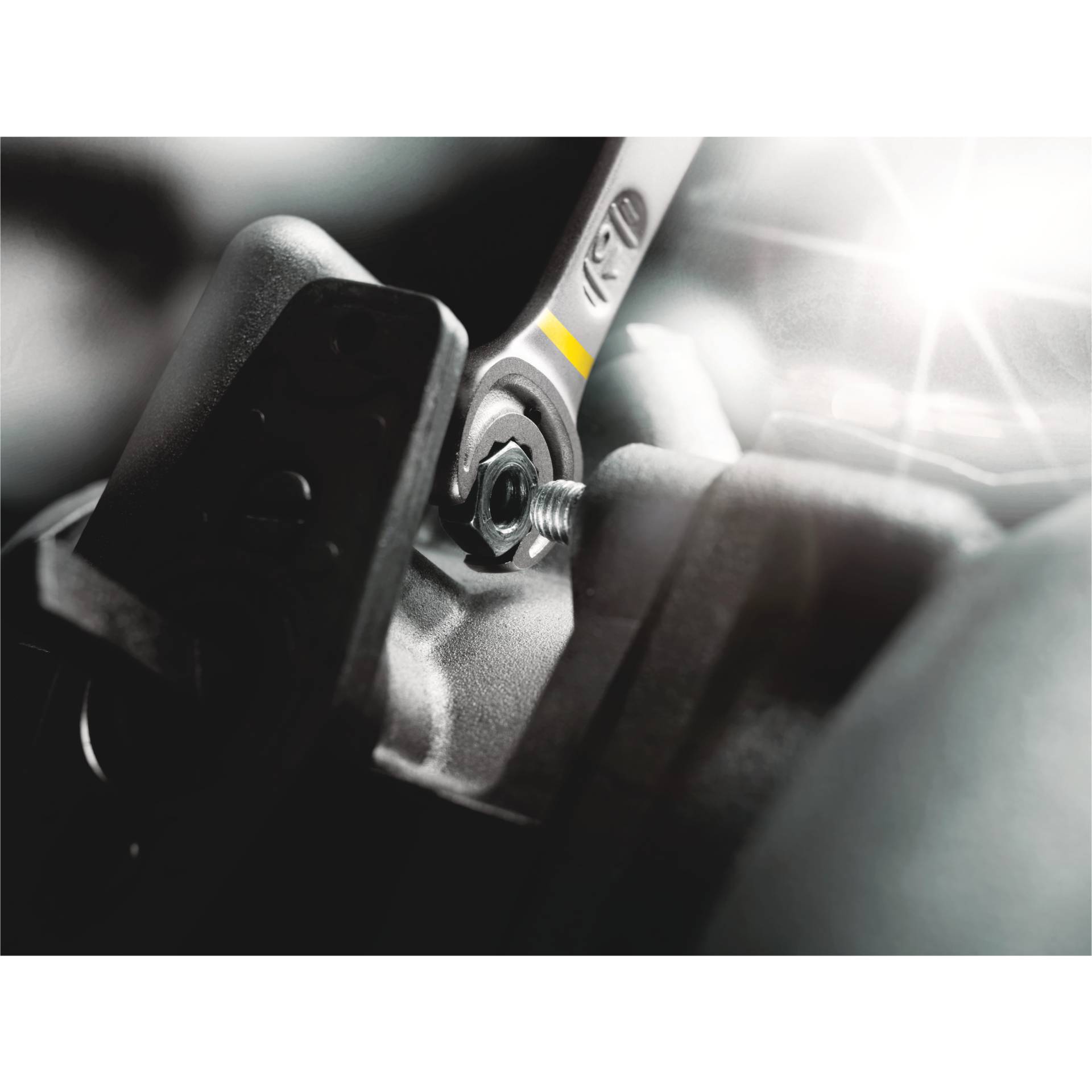 Hochwertiger Ringratschen-Maulschlüssel-Satz von Wera: Alles, was ein Schlüssel können muss. Und noch viel mehr. Schneller, besser, schöner. Eben ein echter Joker. Die neue Generation der Maul-Ringratschen-Schlüssel. 8-teiliger Satz mit zölligen Schlüsseln in robuster Tasche. Für Sechskant-Schraubenköpfe bzw. -Muttern. Mit Haltefunktion durch Metallplatte im Maul, die die Gefahr des Verlierens von Schrauben und Muttern reduziert. Die auswechselbare Metallplatte im Maul sichert mit extra harten Zähnen Schrauben und Muttern und reduziert die Abrutschgefahr. Der integrierte Endanschlag kann das Abrutschen vom Schraubenkopf nach unten verhindern und ermöglicht das Aufbringen hoher Drehmomente. Die Doppelsechskantgeometrie sorgt für die formschlüssige Verbindung mit Schraube oder Mutter und damit für die Verringerung der Abrutschgefahr. Ein Rückschwenkwinkel von nur 30° auf der Maulseite vermeidet zeitintensives Wenden des Schlüssels beim Schrauben. Ratschenmechanik auf der Ringseite mit außergewöhnlich hoher Feinverzahnung von 80 Zähnen für Flexibilität auch in engen Bauräumen. Die spezielle Schmiedegeometrie sorgt für hohe Drehmomentübertragung und hohe Biegungssteifigkeit. Gefertigt aus leistungsfähigem Chrom-Molybdän-Stahl mit Nickel-Chrom Beschichtung für hohen Korrosionsschutz. Mit Werkzeugfinder "Take it easy": Farbkennzeichnung nach Größen.