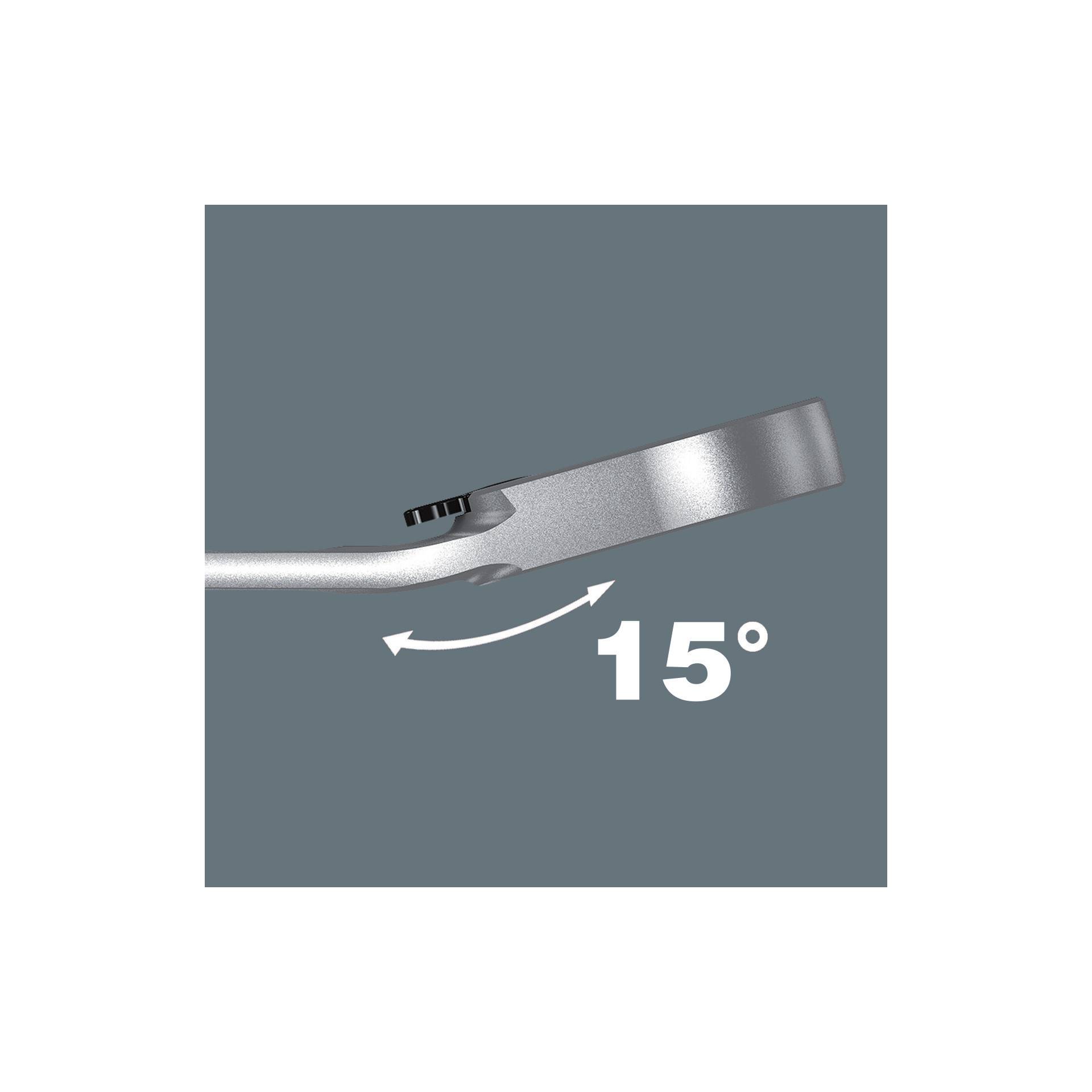 Hochwertiger Ringratschen-Maulschlüssel-Satz von Wera: Joker Maulringratschenschlüssel mit abgewinkelter Ratschenseite und Umschalthebel. Mit Haltefunktion durch Metallplatte im Maul, die die Gefahr des Verlierens von Schrauben und Muttern reduziert. Der integrierte Endanschlag kann das Abrutschen vom Schraubenkopf nach unten verhindern und ermöglicht das Aufbringen hoher Drehmomente. Die auswechselbare Metallplatte im Maul sichert mit extra harten Zähnen Schrauben und Muttern und verringert die Abrutschgefahr. Die Doppelsechskantgeometrie sorgt für die formschlüssige Verbindung mit Schraube oder Mutter und damit ebenso für die Verringerung der Abrutschgefahr. Der geringe Rückschwenkwinkel von nur 30° auf der Maulseite vermeidet zeitintensives Wenden des Schlüssels beim Schrauben. Die umschaltbare Ratschenmechanik auf der Ringseite mit hoher Feinverzahnung (80 Zähne) sorgt für hohe Flexibilität auch in engen Bauräumen. Hörbar präzise Ratschenmechanik. Das robuste zweiteilige Rast-Element ermöglicht darüber hinaus eine extreme Standfestigkeit. Mit um 15° abgewinkelter Ratschenseite für sicheres Arbeiten bei hohen Drehmomenten. Die spezielle Schmiedegeometrie sorgt für hohe Drehmomentübertragung und hohe Biegesteifigkeit. Gefertigt aus leistungsfähigem Chrom-Molybdän-Stahl mit Nickel-Chrom Beschichtung für hohen Korrosionsschutz. Mit Werkzeugfinder "Take it easy": Farbkennzeichnung nach Größen.