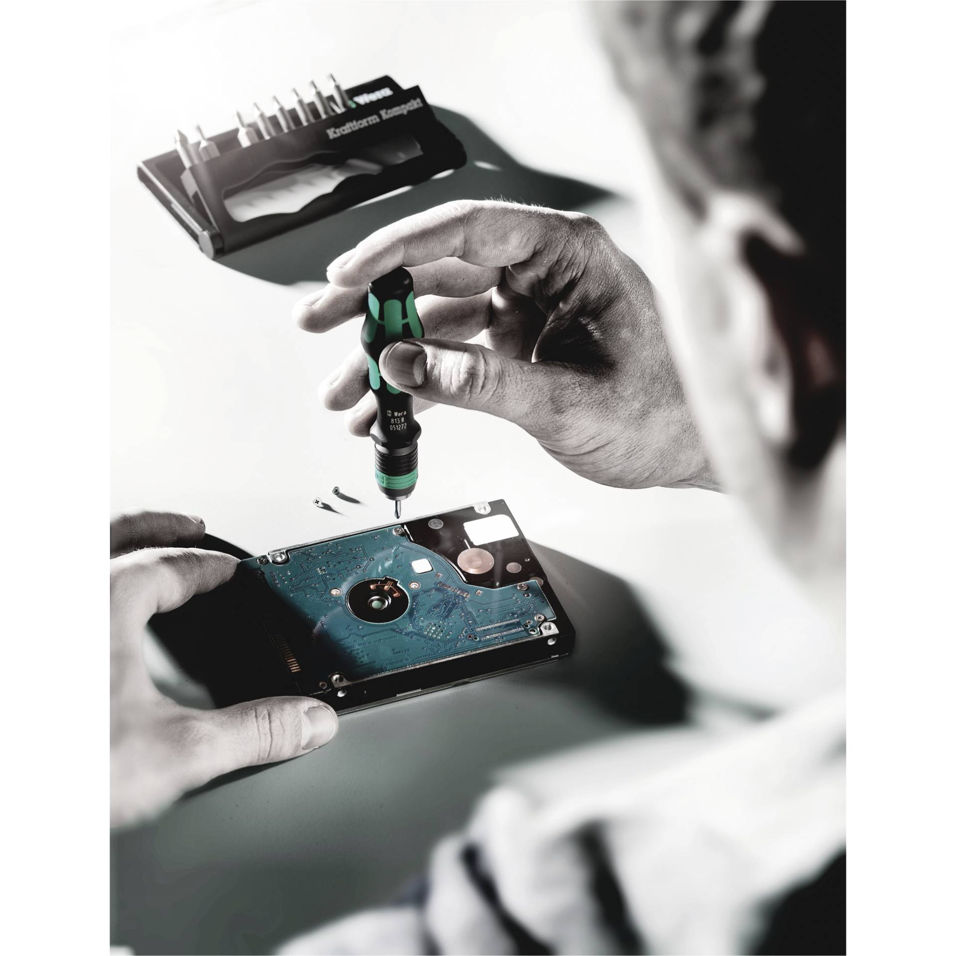 9 zähharte Wera Bits, für den universellen Einsatz. Torsionsform gegen frühzeitigen Verschleiß. 1 Handhalter 813 R Kraftform mit Schnellwechselfutter Rapidaptor, mehrkomponentig für hohe Arbeitsgeschwindigkeiten und besonders ergonomisches Verschrauben.